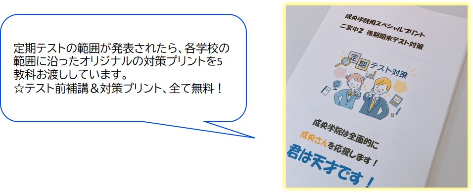 ・定期テスト前には、各中学校に合わせたテスト対策プリントをそれぞれ作成しています。