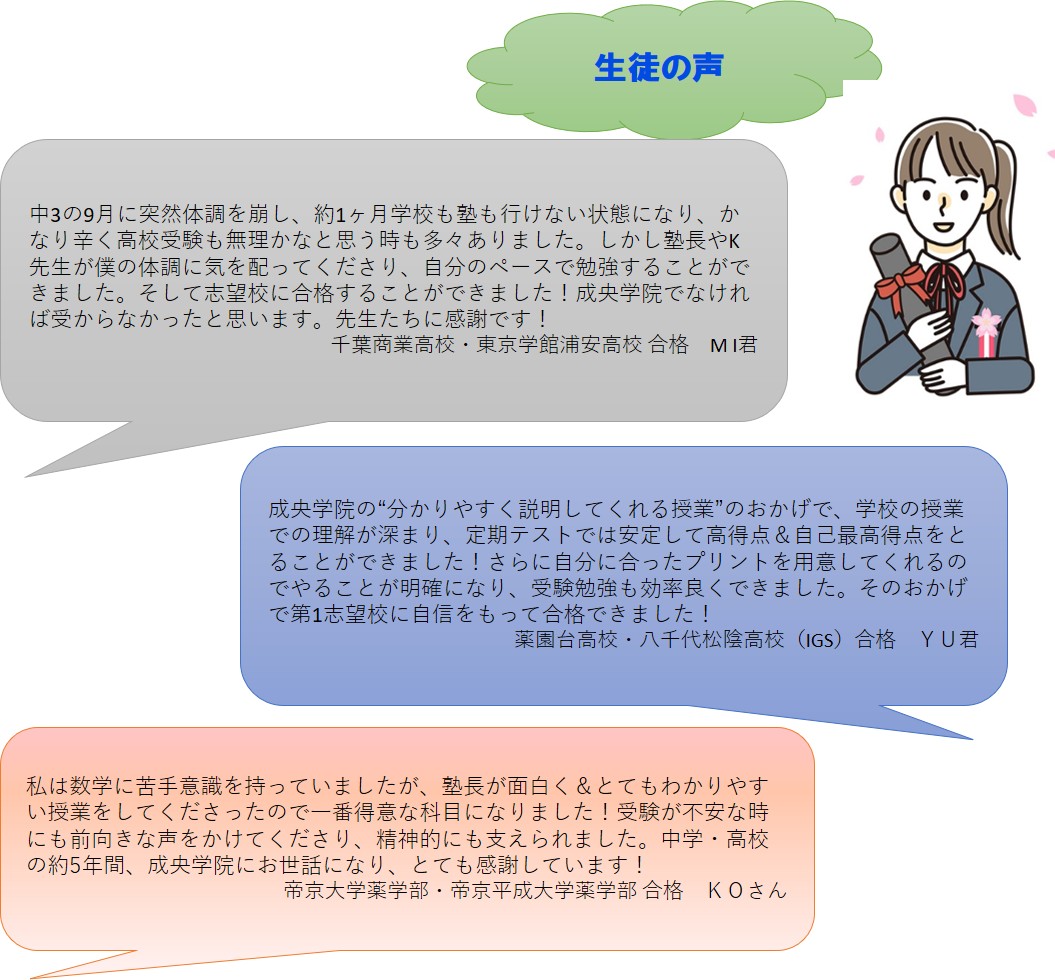 入試で合格するためには、学力だけではなく信頼できる最新の情報をいち早く知ることが必要です。当学院は、平成元年設立ですので、膨大な入試情報があります。さらに、千葉県認可の『千葉学習塾協同組合』などに加盟しており、そちらからも、多くの情報をいち早く入手しています。